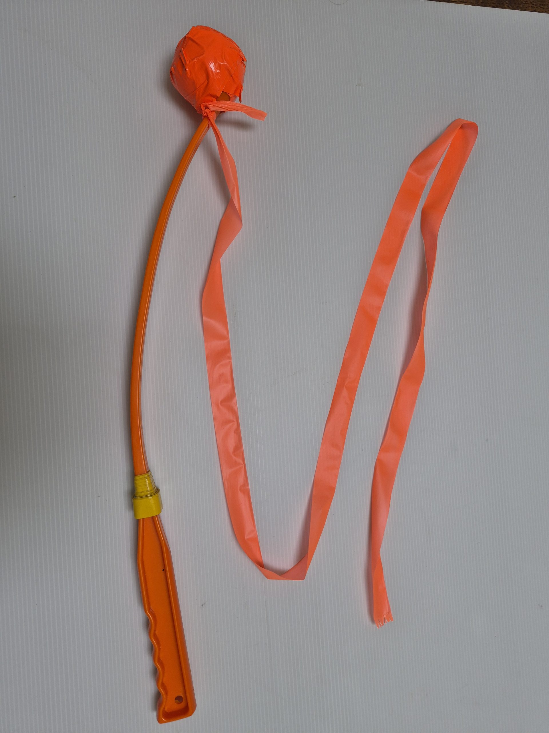 Take the flagging roll and pull off about six feet of tape. Simply tie it around the Instant Swing Groover nearest the taped ball end as shown in the picture below. Make sure you have plenty of room to swing your new whip in. If you whip the ISG really fast pieces of the flagging tape will break off of the end ...this is normal and it's a great sign you're moving quickly! When it gets too short or worn out it's easy to tie another piece on anyway ;)